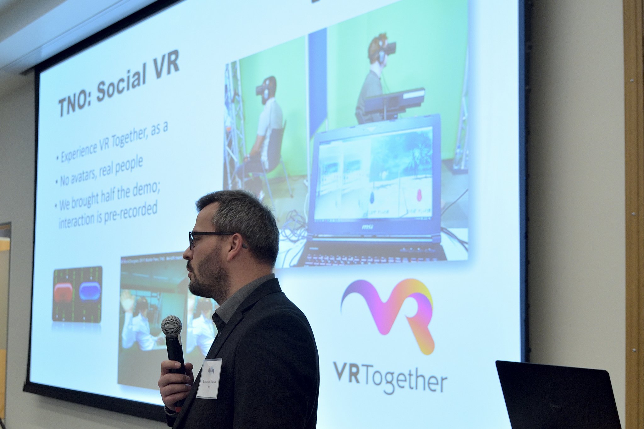 The workshop was co-chaired by Rob Koenen, VRIF President and Principal at VRTogether partner TNO. TNO further participated in the event by promoting Social VR, with Emmanuel Thomas showcasing an early-stage demo that allowed visitors to get a first feel for how the project partners will enable shared and social VR experiences. The participants provided useful feedback on the relevance of social VR and the demonstrated technology, and were keen to test and use further evolutions of the technology. Interestingly, many presenters talked about the need for making VR a more social experience.
